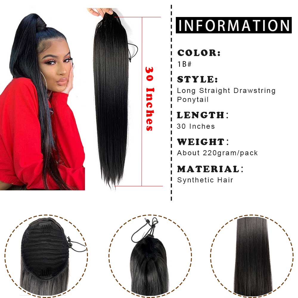 - SIZE: 30inch long ponytail extension for black women, long drawstring ponytails for black women, 220 Gram/pack (about 8 OZ)