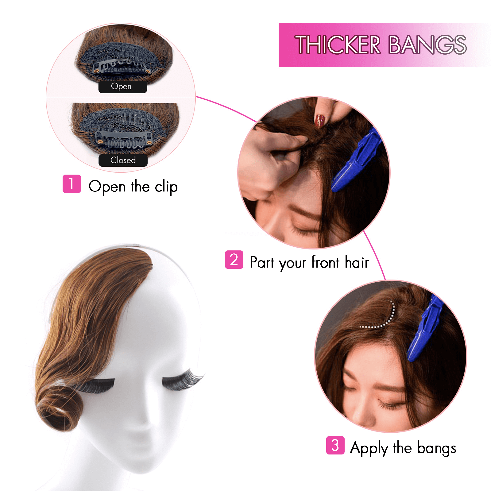 • ADVANTAGE: Full and thick fake fringe bangs long side bangs hair clip-in for Women. It is very easy to wear, simple and elegant, and is liked by many beautiful ladies. Suitable for any occasion, Party, Daily or Wedding