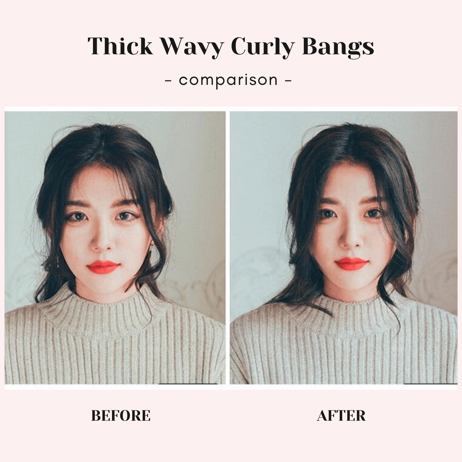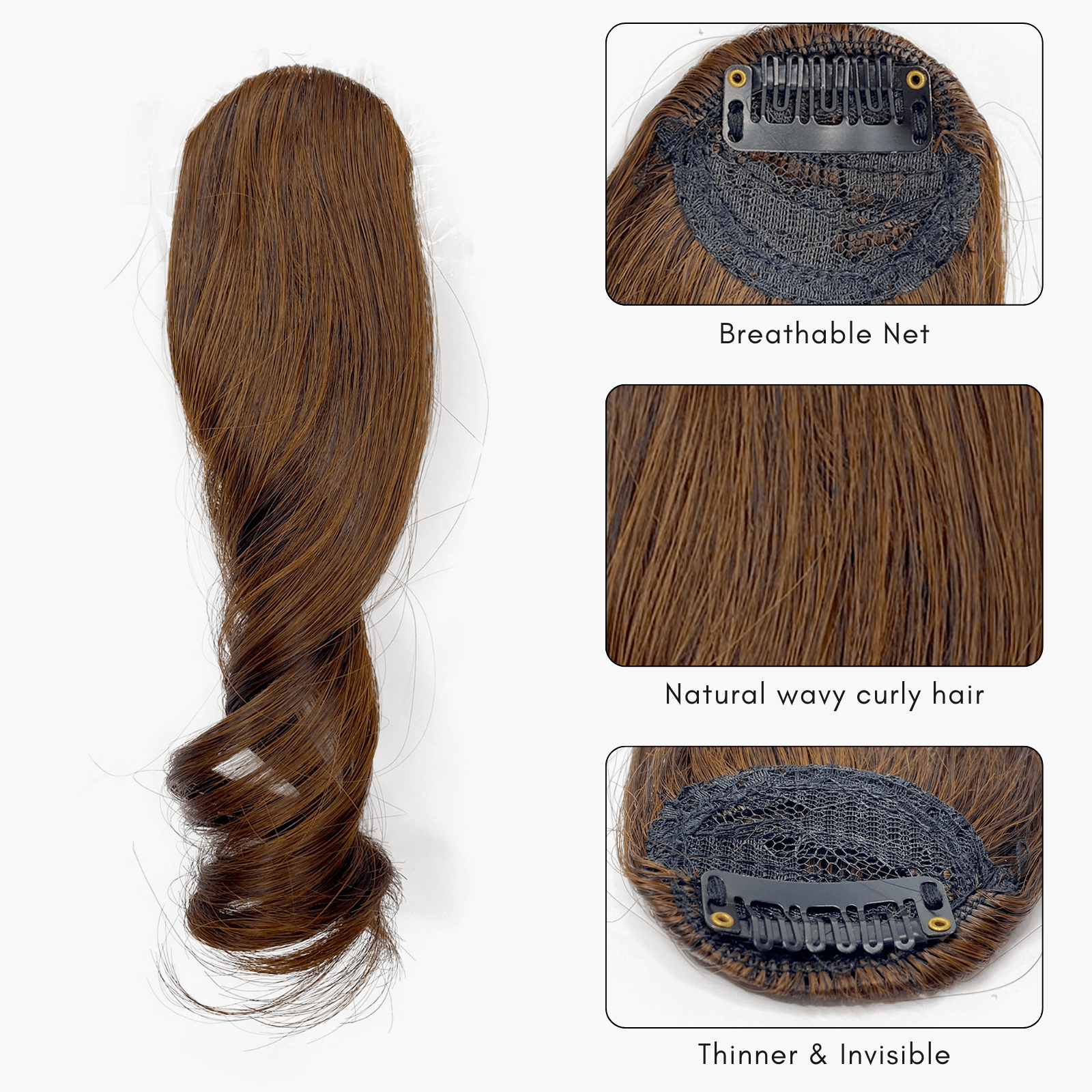 • SIZE: 14inch (35cm) Long wavy curly swept bangs hair piece. Natural clip on fringe bangs side part. Bangs hair is full and thick but not heavy. Lightweight, comfortable wearing, and simple care